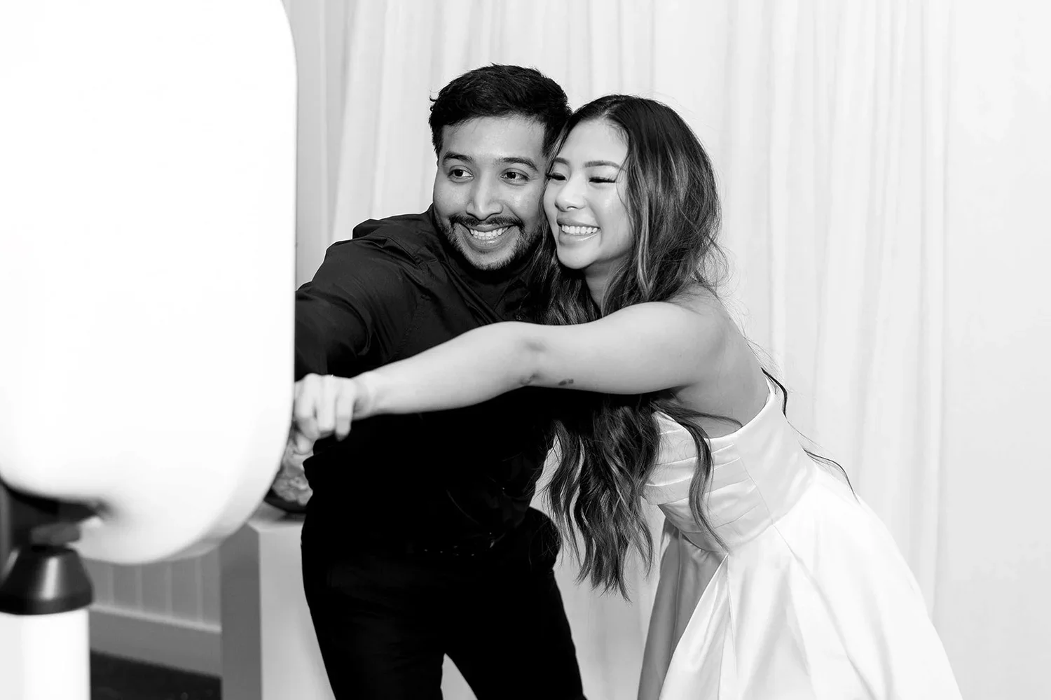 Our Spotlight Booth uses dramatic lighting and stylish black-and-white tones to create eye-catching, editorial portraits that make every guest feel like a star.